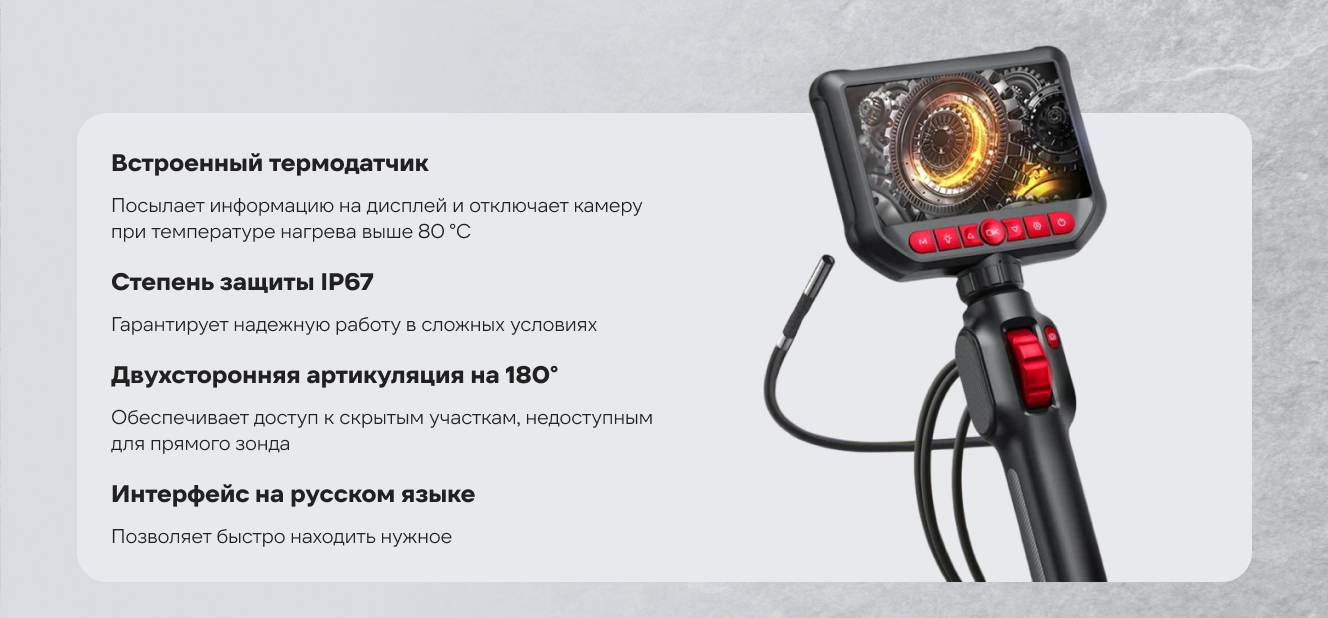 Зонд прибора имеет встроенный термодатчик, он отключает прибор при достижении температуры 80 °C во избежание перегрева головки камеры. Показания термодатчика выводятся на экран в режиме реального времени.