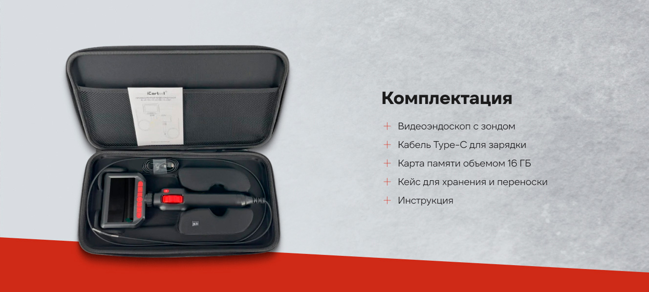 iCartool IC-VC153 управляемый видеоэндоскоп с зондом малого диаметра, поворотной камерой на 360° и экраном диагональю 4,3”. Экран с IPS-матрицей имеет простой и удобный интерфейс. Камера разрешением 2 Мп обеспечивает качественную картинку, а пошаговый цифровой зум помогает рассмотреть мелкие детали.