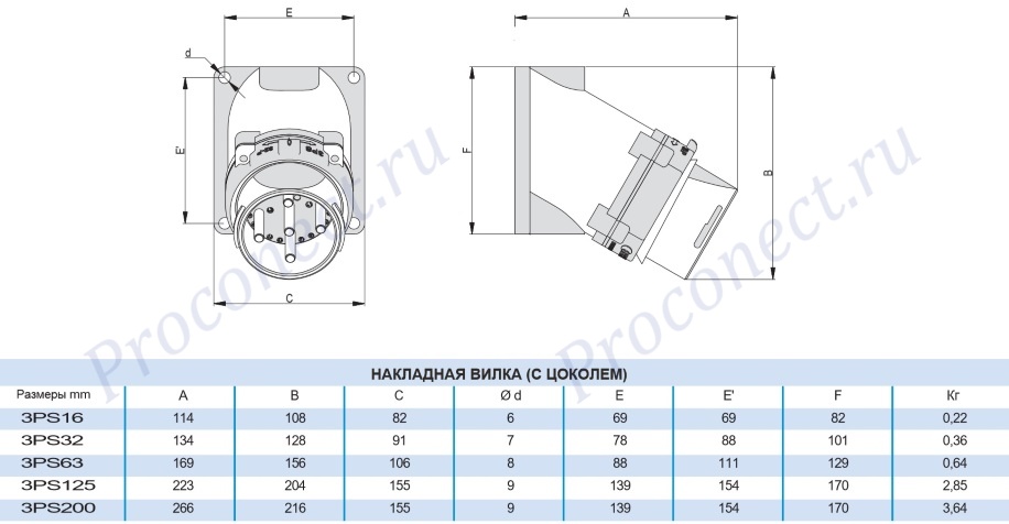 Настенная накладная вилка Proconect 3PS9A3NE01 + 3PS9WA-S рассчитана на номинальный ток 150А и напряжение 380-440 В. Она имеет контактную группу 3P+N+E. Максимальное сечение одножильного провода составляет 70 мм², максимальное сечение многожильного провода 50 мм². Степень защиты IP66 гарантирует вам хорошую износостойкость оборудования. Все промышленные разъёмы Proconect 3PS125 соответствуют стандартам IEC 60 309 - 1, IEC 60 947-3, IEC 60 529, Décret № 88-1056. Вес вилки 3PS9A3NE01 + 3PS9WA-S составляет 2,85 кг.