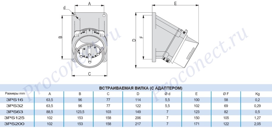 Вилка панельная встраиваемая угловая Proconect 150А 3P+E 380V IP66/67 3PS9A30E01 + 3PS9-LB