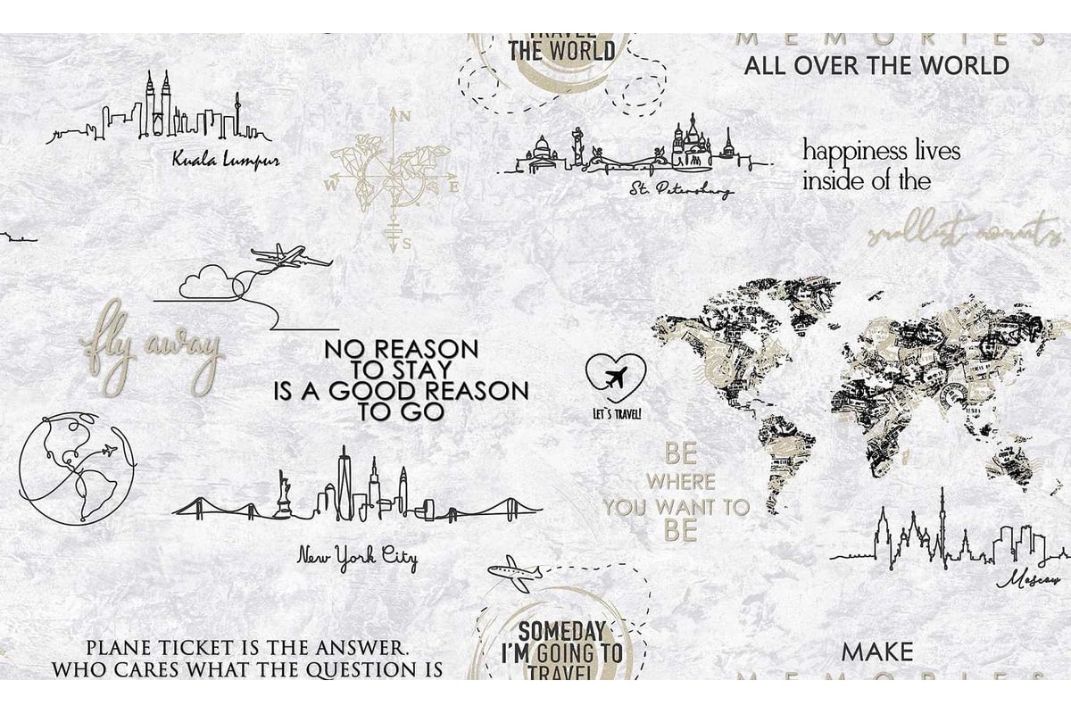 Коллаж из мотивирующих надписей и контурных силуэтов городов собирается в стильный, неперегруженный дизайн, поэтому мотивы можно использовать на все четыре стены. Актуальные фоны-компаньоны с текстурой штукатурки послужат отличной базой для оформления любого помещения в разных стилистических решениях.