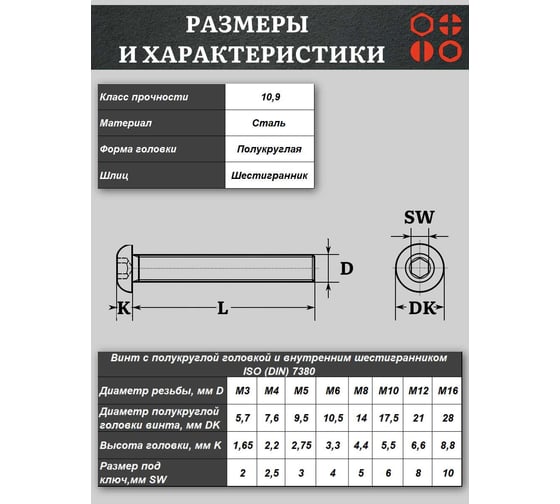 Винт чёрный под шестигранник ISO 7380, класс прочности 10.9 – высокопрочный крепёж для надежных соединений. Прочный и долговечный винт с полукруглой головкой и внутренним шестигранником соответствует международному стандарту ISO 7380. Изготовлен из закалённой углеродистой стали, что обеспечивает высокую прочность (класс 10.9) и устойчивость к нагрузкам. Внутренний шестигранник (шлиц) – удобство монтажа с помощью ключа-шестигранника. Точность изготовления – гарантирует плотную посадку и надежное крепление. Полукруглая головка – обеспечивает аккуратный внешний вид и снижает риск повреждения поверхностей. Применение: подходит для машиностроения, сборки металлоконструкций, ремонта автомобилей и промышленного оборудования. Благодаря высокому классу прочности 10.9 выдерживает значительные механические и вибрационные нагрузки.