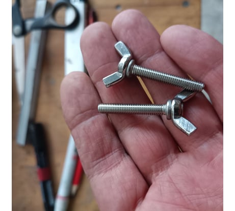 Все характеристикиВинт-барашек М5х16 мм , нержавеющая сталь DIN 316 (2 шт.) Барашковые винты DIN316 предназначены для работы в резьбовых соединениях требующих периодической сборки/разборки. Крепежные изделия удобны в эксплуатации и при монтаже, поскольку для их закручивания не требуется дополнительный инструмент. Затяжка винта производится усилием пальцев рук без использования ключа. Более того, для затяжки не рекомендуется использовать дополнительный инструмент, так как возможно повреждение лепестков Особенно актуально для процессов сбора мебели, а также для сборки изделий, нуждающихся в частом демонтаже. Винт «барашек» DIN 316 изготовлен из нержавеющей стали, класс прочности крепежа – А2.