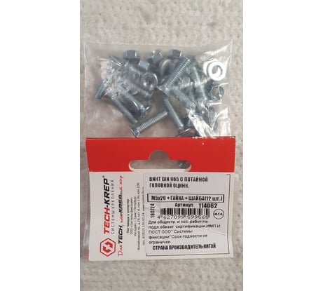 Вопросы и ответы об оцинкованном винте с потайной головкой Tech-Krep M5х20 DIN965 (12 шт.) + гайка + шайба 114062