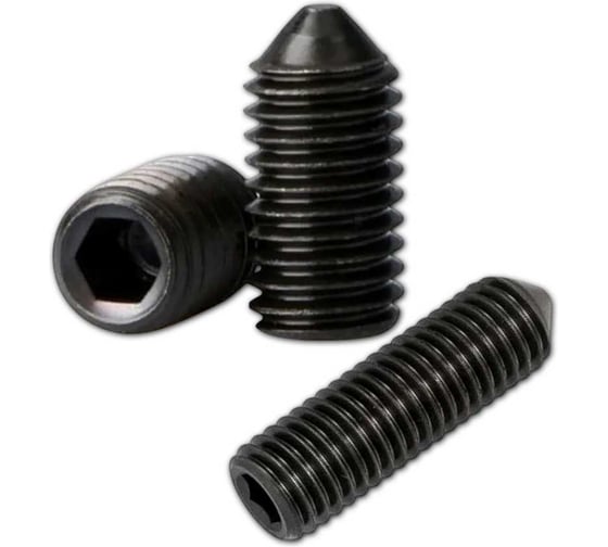 DIN 914 - винт установочный с полной метрической резьбой, с острым концом используется для соединения элементов конструкций в машиностроении, приборостроении и прочих промышленно-производственных отраслях совместно с гайками, шайбами соответствующих размеров. Его можно отличить по отсутствию головки, где шлиц (углубление под плоскую отвертку или шестигранник) находится непосредственно в торце. Корпус крепежа полностью выполнен в виде резьбы и, проходя через гнездо в детали, упирается в него на всю свою длину, что повышает надежность сцепления.