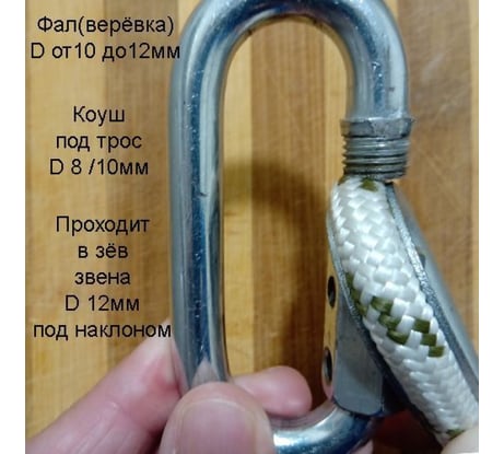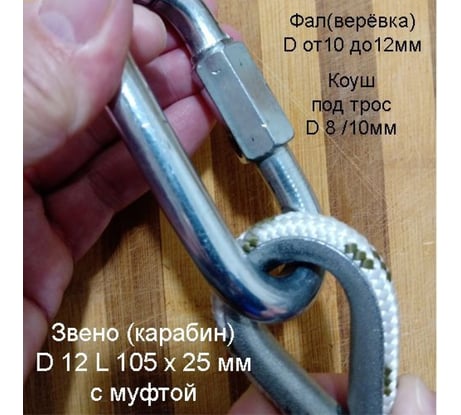 В связи с вышеизложенным приходилось проверять опытным путём "на рывок" до разрыва фала (верёвки) прочностные характеристики аналогичного карабина (винтового звена с муфтой М 12, хром по стали марки (?!))), купленного на рынке в Москве, который легко без каких-либо повреждений (гайка свободно открутилась и закрутилась) выдержал разрыв фала прочностью 15 kn (1500кг) до 20kn (2000кг).