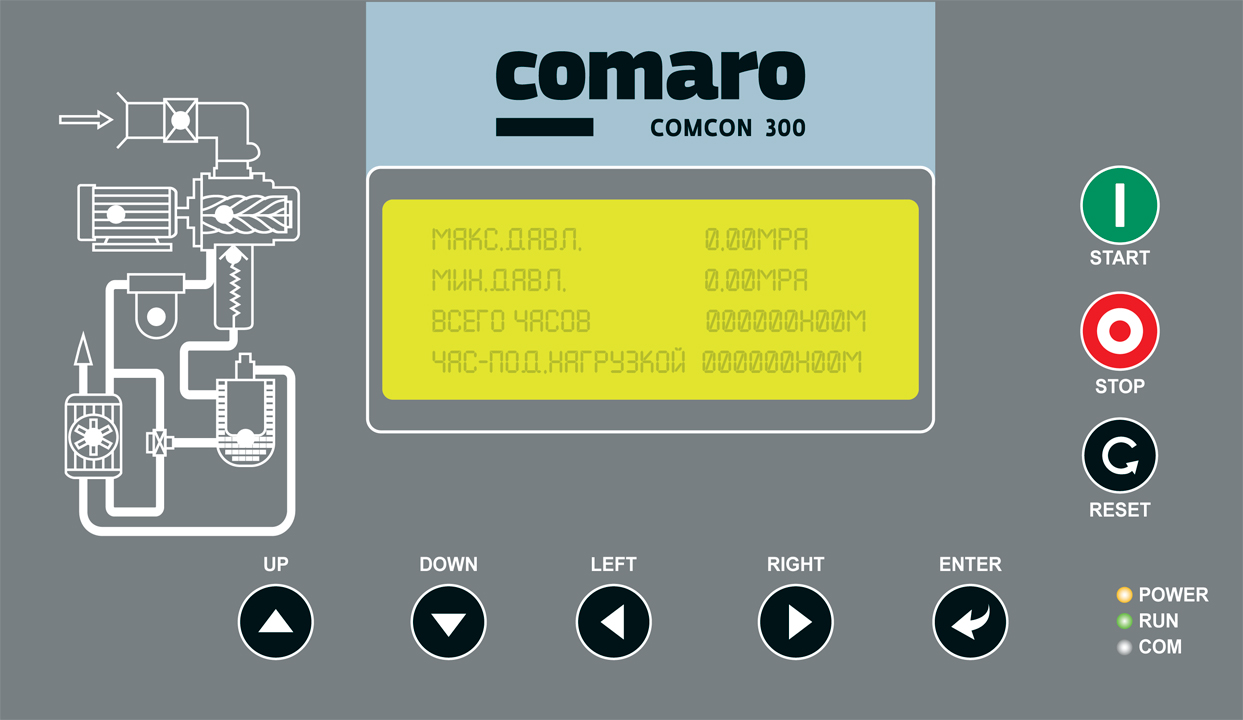 Микропроцессорное управление Модель оснащается электронным блоком управления COMCON 300 с информативным LCD-дисплеем на русском языке для контроля рабочих параметров, который сообщает о необходимости технического обслуживания и возможных неполадках в системе. |
