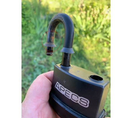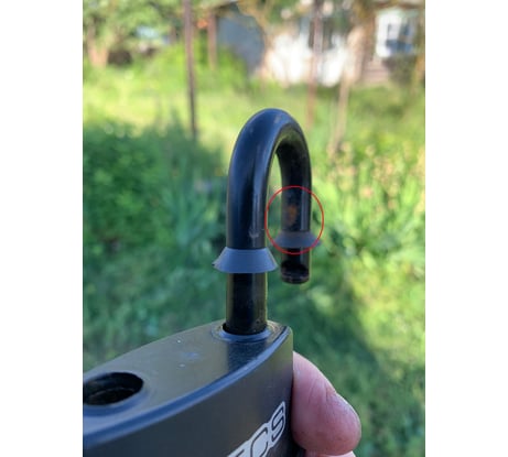Повесил замок на даче на входной калитке. Лето почти без осадков. Однако, на дужке замка уже образовалась ржавчина, размер которой продолжает расти (выделил место ржавчины на фото красным овалом). И это несмотря на то, что перед началом эксплуатации замок был полностью смазан хорошей проникающей смазкой, как внутри, так и снаружи примерно месяц назад. Резиновые прокладки на дужке замка свою функцию защиты не выполняют. Они свободно болтаются по дужке и смещаются при малейшем прикосновении, в итоге, резинки неплотно прилегают, соответственно, влага проникает внутрь замка. А если еще закрыть снизу личинку резиновой заглушкой, то все становится еще хуже. Влага не вытекает из замка, а остается внутри. Открываешь заглушку и изнутри вытекает ржавая вода потоком. Замок начинает ржаветь и внутри. А зимой весь механизм точно полностью замерзнет, и замок будет невозможно открыть.