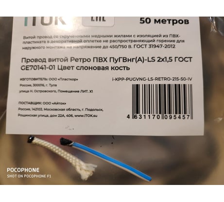 Витой провод iTOK Ретро, ПВХ, ПуГВнг(А)-LS 2x1,5, ГОСТ, слоновая кость (50 метров) GE70141-02 i-KPP-PUGVNG-LS-RETRO-215-50-IV