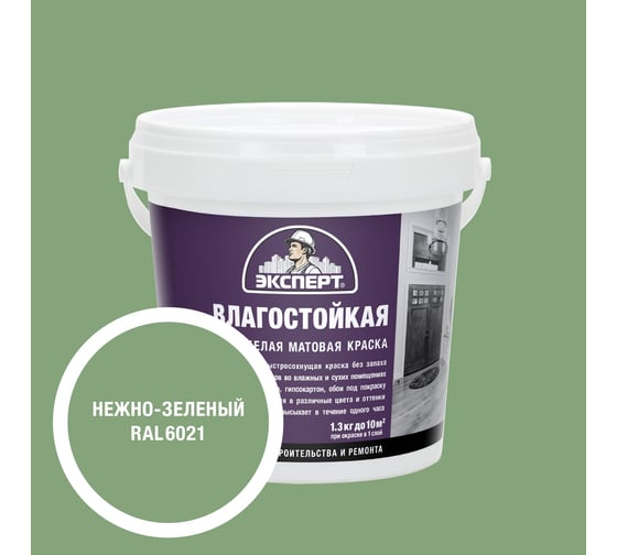 Краска ЭКСПЕРТ влагостойкая цвет Нежно-зеленый 1,3 кг 34783 применяется для окраски стен и потолков внутри сухих и влажных помещений. Состав наносят на бетонные и оштукатуренные поверхности, гипсовые и гипсокартонные плиты, структурные и стеклообои.
