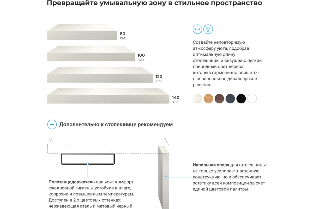 Конструкция позволяет осуществлять монтаж на удобной для потребителя высоте и фиксируется к стене прочными металлическими кронштейнами (скрытая система креплений повышает устойчивость изделия и обеспечивает внешнюю эстетику). Наличие небольших неровностей и перепадов уровня стен можно нивелировать регулировкой кронштейнов по горизонтали. Надежная и безопасная установка обеспечивает нагрузку на столешницу до 150 кг.