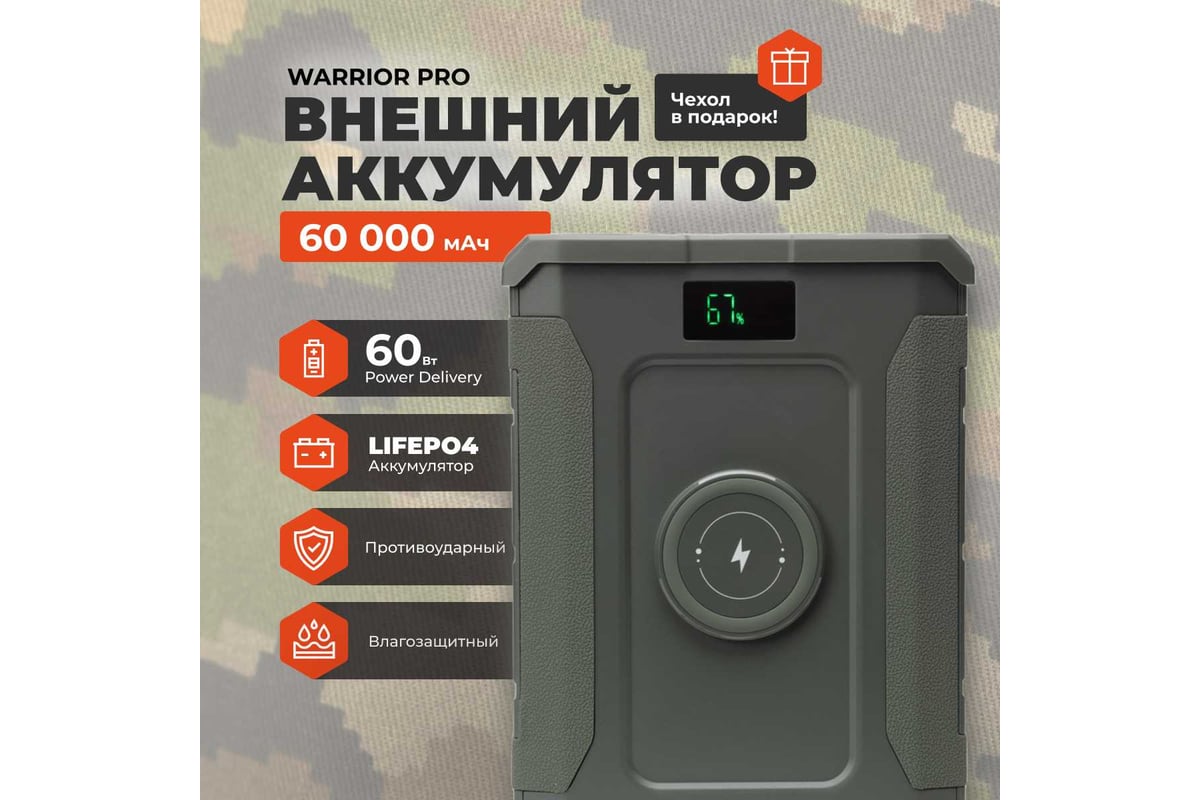 Warrior Pro — надёжный LiFePo4 портативный внешний аккумулятор в ударопрочном корпусе. Емкость 60 000 мАч, беспроводная зарядка, 5 выходных интерфейсов, включая автомобильную розетку, обеспечивают максимальную функциональность в экстремальных условиях.