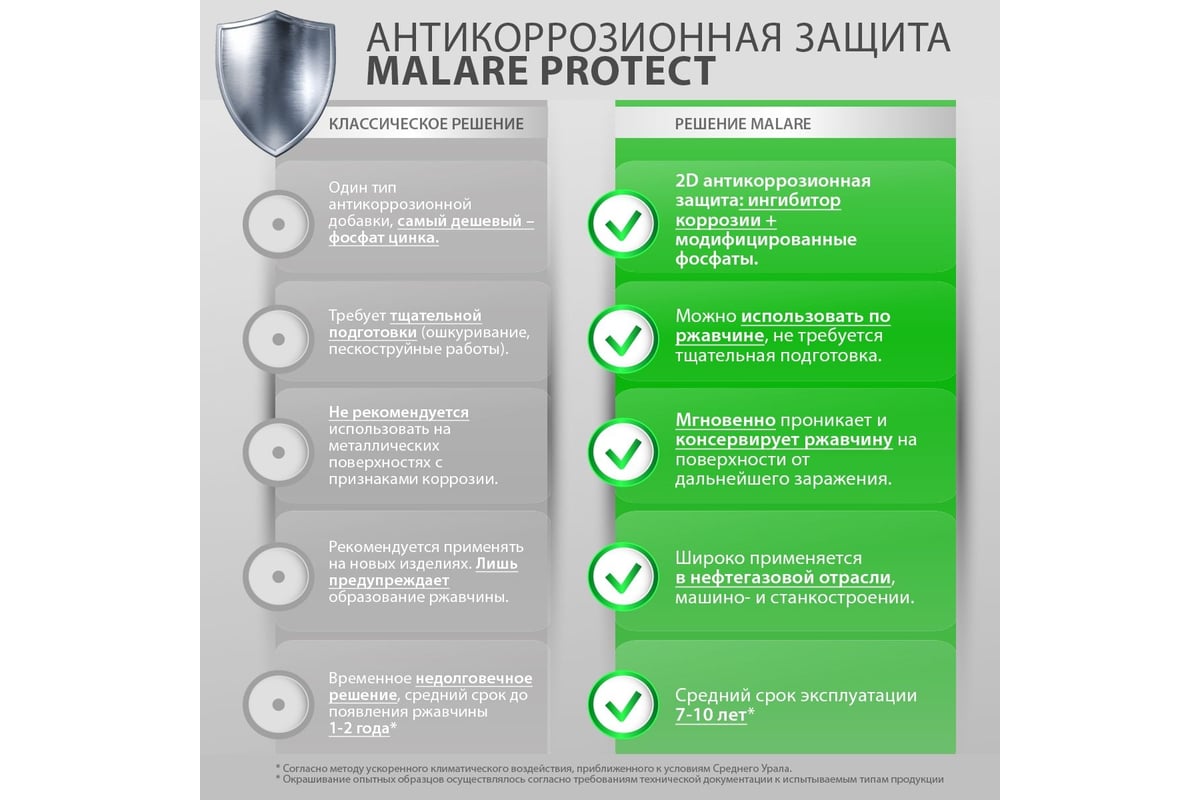 - 100% антикоррозионная защита металла (ингибитор коррозии): антикоррозионные материалы Malare ®содержат импортный ингибитор коррозии, который не только защищает новый металл, но и консервирует ржавчину на ранее использованных конструкциях (в отличие от дешёвого фосфата цинка)