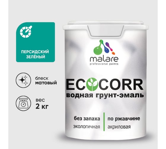 Грунт-Эмаль 3в1 MALARE матовая акриловая быстросохнущая без запаха для металлических поверхностей персидский зеленый 2 кг 2036747664289