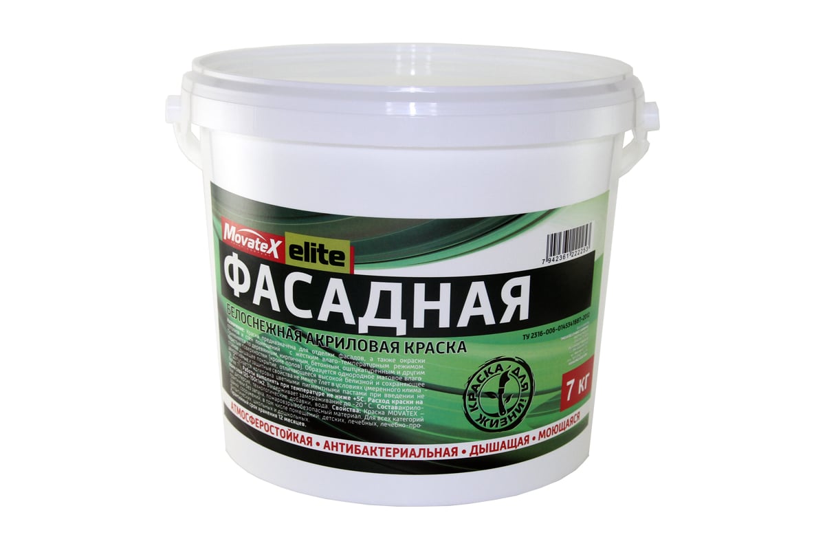 Водоэмульсионная краска Movatex Elite фасадная, 7 кг Т11902 применяется для нанесения на деревянные, кирпичные, бетонные, оштукатуренные поверхности.