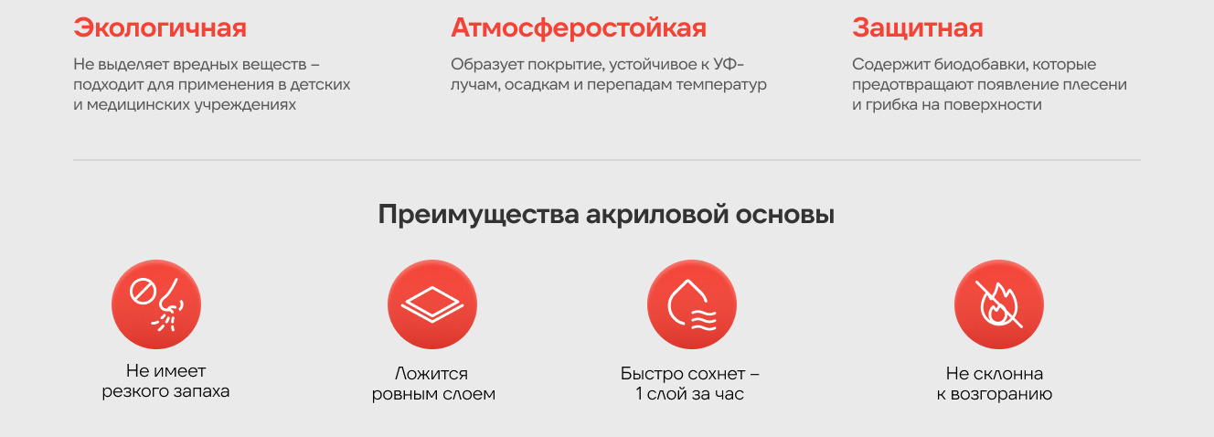 Благодаря акриловой основе, продукт образует матовое дышащие покрытие. Краска не токсична, может применяться в детских и лечебных учреждениях.