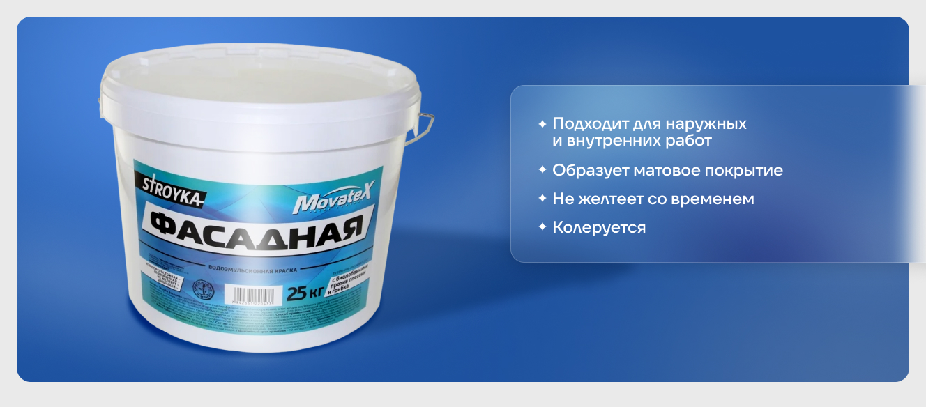 Водоэмульсионная краска Movatex Stroyka фасадная, 25 кг Т31726 применяется для нанесения на деревянные, кирпичные, бетонные, оштукатуренные поверхности.