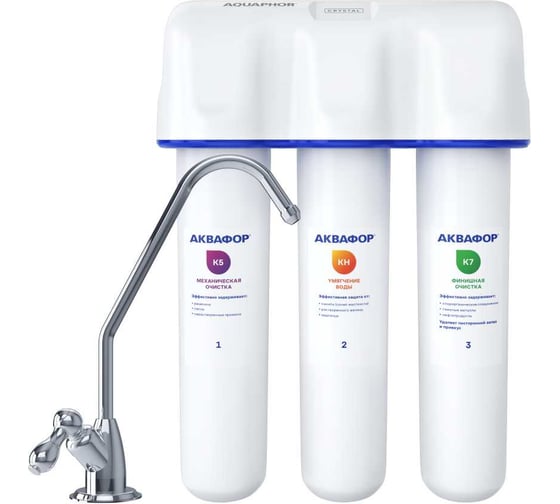 Водоочиститель Аквафор Кристалл А для жёсткой воды Кристалл НА устанавливается под мойку. В комплект поставки входит все необходимое для монтажа водоочистительного комплекта.