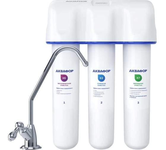 Водоочиститель Аквафор модель Кристалл А исп.2 обеспечивают трехступенчатую очистку воды: предварительную очистку, глубокую очистку и финишную сорбционную очистку. Три модуля удаляют вредные примеси, очищают воду от песка, ржавчины и других веществ. Замена одного фильтра занимает 1 минуту.