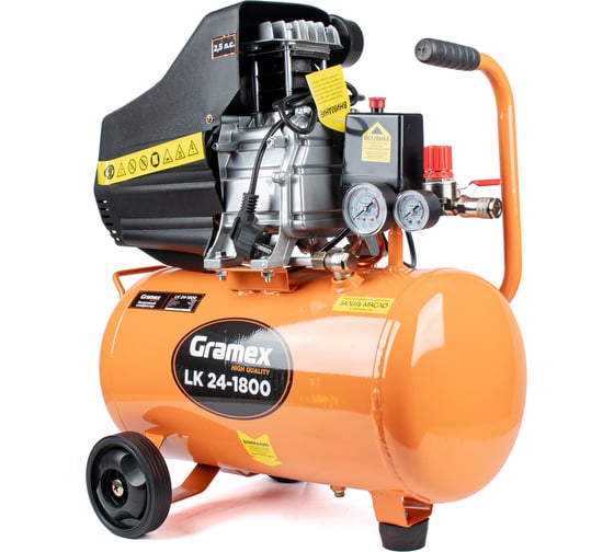 Компрессор воздушный GRAMEX LK 24-1800 представляет собой современный агрегат, с мощным двигателем 2850 об/мин, который вырабатывает воздух со сжатием в 8 бар.