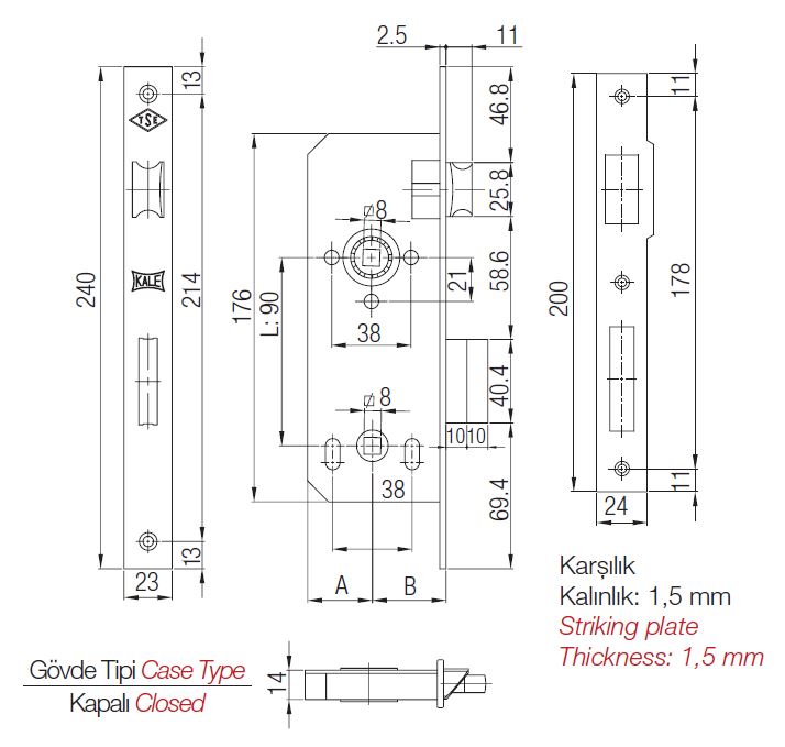 Технические характеристики замка KALE KILIT 90BS40, 23NP, SP, STB