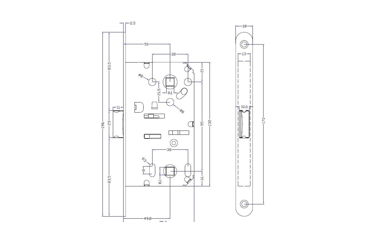 Технические характеристики врезного замка Hafele WC никель полированный, 50/196/18/95 /8/8