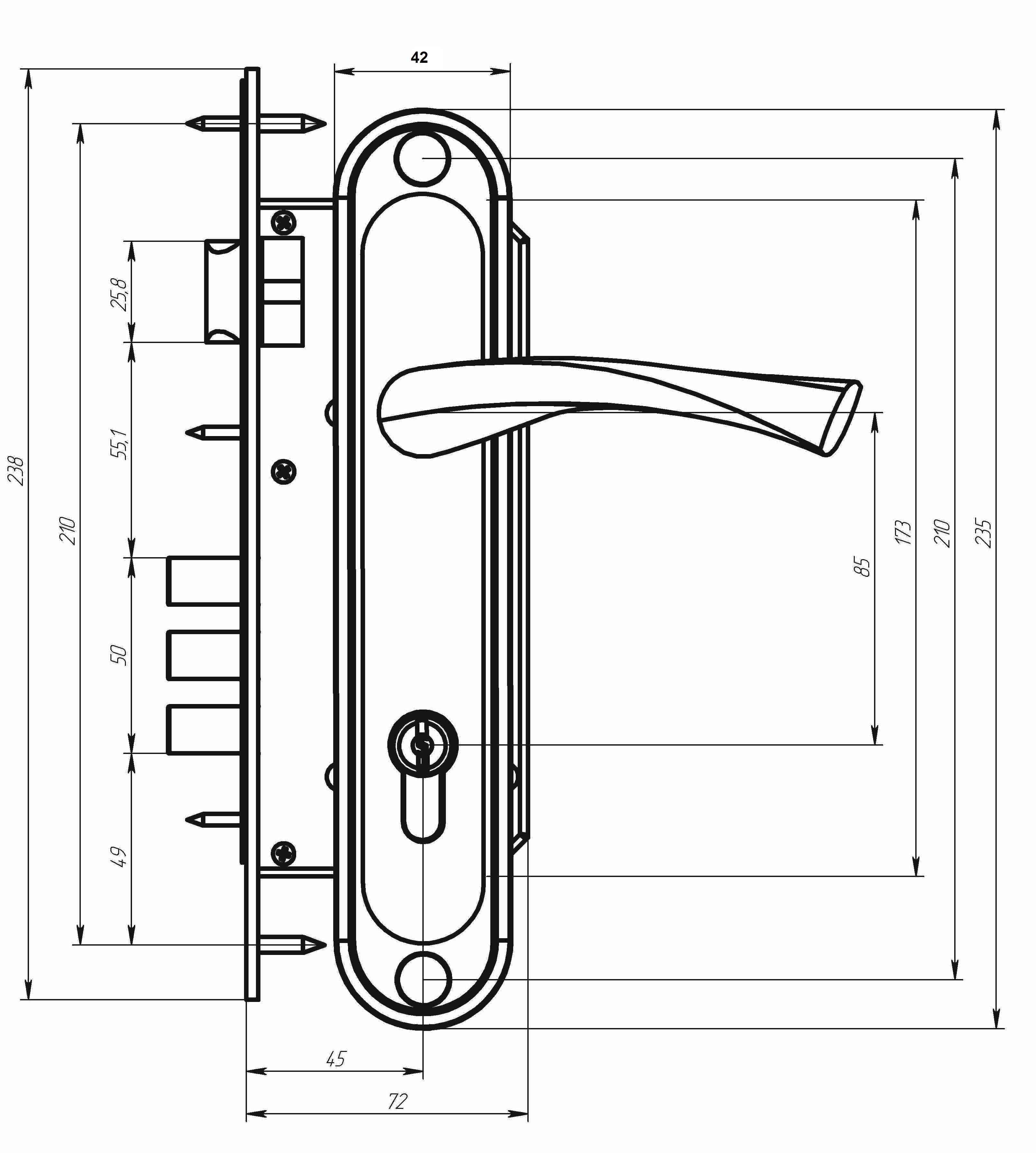 Корпус замка, засов выполнены из стали, ручки - из алюминия с гальваническим покрытием.