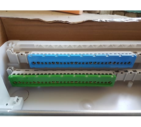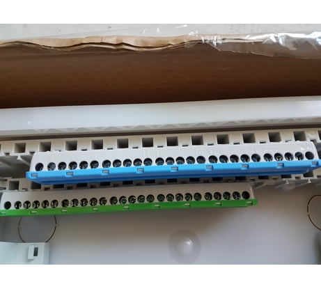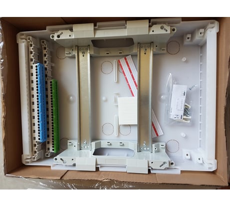 Дома смотрится супер. Внутри есть все для подключения. Но я докупил 3 ноля для трёх узо. Установка в пазы. Все супер. Для проводки есть матрица, по которой можно вырезать необходимое отверстие. Завод проводов как сверху, так и снизу. Места полно. Использовал первый раз, отталкивался на то, что без опыта с ним работать очень легко.