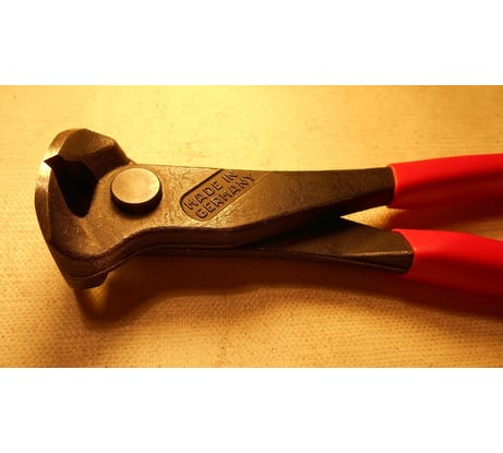 Сразу покупал под переделку, поэтому на фото изделие не в оригинальном виде. Губки потребовалось сошлифовать до плоскости. Понятно, что это ослабит режущую кромку, но деваться некуда -- нужны клещи для реза заподлицо. Ждать аналог из Америки -- не реально по срокам и ценам, поэтому выбрал Книпекс. Ещё момент: сталь высокоуглеродистая, поэтому не эксплуатировать во влажной среде, под дождём и т.п.; хранить в сухом месте (лучше подобрать пластиковый герметичный контейнер). И конечно не надо шлифовать губки самостоятельно, т.к. запросто можно просадить глубину съёма или завалить сторону и тогда губки не будут сходиться.