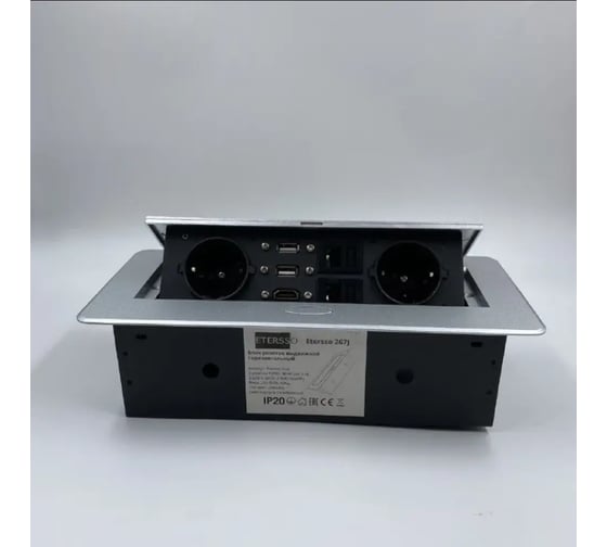Выдвижной встраиваемый блок розеток представляет собой металлический прямоугольный розеточный блок на 2 EURO розетки, 2 RJ45, 2 USB-А DATA, HDMI.