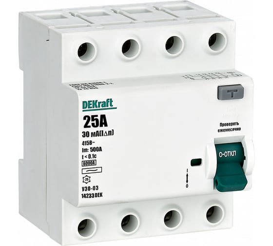 - Выключатель дифференциального тока DEKraft 4P 25А 30мА тип AC 6кА УЗО-03 14233DEK применяется для защиты человека от поражения электрическим током при контакте с токопроводящими частями.
