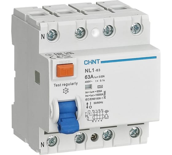Выключатель дифференциального тока (УЗО) CHINT NL1-63 4P 40А 100мА 6кА тип AC (DB) (R) 200227