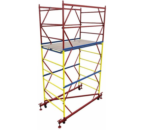 Рабочая площадка размером 1,2×2 м, расположенная на высоте 2,8 м, обеспечивает достаточно места для размещения инструментов и материалов, что удобно для выполнения монтажных, фасадных и отделочных работ. Несмотря на высоту, конструкция остаётся удобной для транспортировки и хранения.