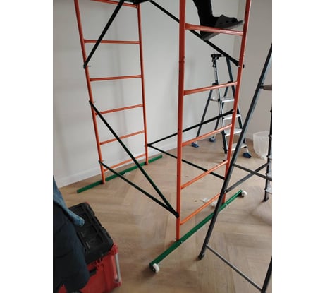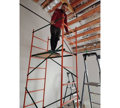 Вышка хлипковата для нагрузки до 250кг,не устойчива на максимально заявленной высоте не слабый болтунец ,явно не хватает 2-3-х диагональных стяжек.Секции нужно обязательно скреплять между собой,отверствия намечены,но не просверлены производитель решил,что покупатели сами их просверлят(экономия на безопасности) или и так сойдёт.