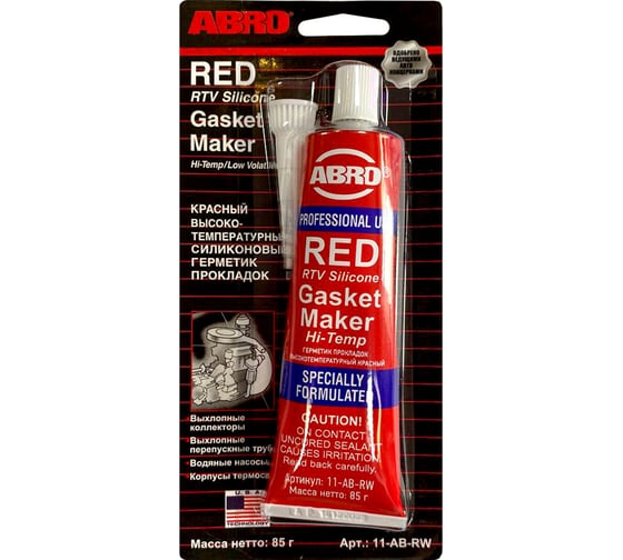 Высокотемпературный герметик прокладок ABRO красный 85г 11-AB-RW обеспечивает надежную герметизацию соединений, ремонтирует и заменяет штатные прокладки из резины и силикона. Продукт используют во время монтажа деталей, работающих при повышенной температуре. Состав образует прочный клеевой шов, который не разрушается под действием масла, воды и антифриза.
