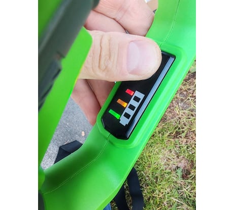 Индикатор заряда батареи, заплечный ремень, безопасный пуск, прорезиненная рукоятка.