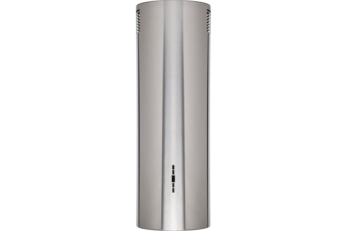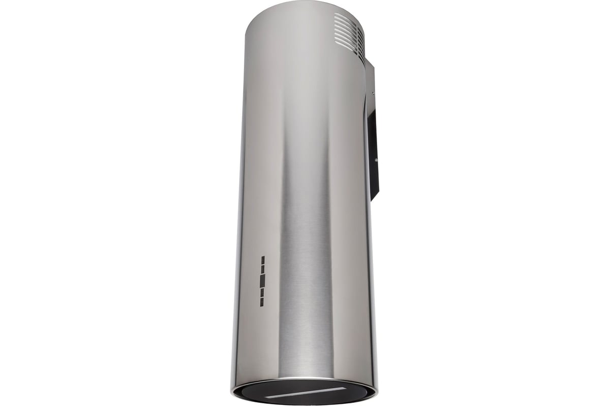 Вытяжка выполнена в форме цилиндра. Геометрические формы повсеместно используется в современных дизайнерских проектах, они ассоциируются с простотой и лаконичностью, привносят в помещение гармонию и стиль. Стильное сочетание стали и блеска закаленного стекла создают ощущение легкости прочной конструкции. Декоративный стеклянный люк скрывает алюминиевый, жироулавливающий фильтр, придавая завершенность композиции.