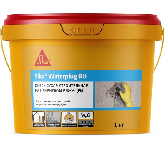 Sika® Waterplug RU - однокомпонентный сверхбыстротвердеющий гидроизоляционный состав на основе специальных цементов и мелкого заполнителя, предназначенyый для быстрой ликвидации активных протечек.