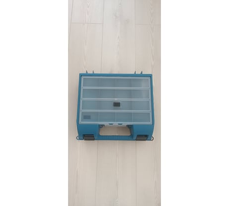 2ух цветный, низ чёрный, верх синий. Есть органайзер, с 12 отделеньями, 8 маленьких и 4 больших, с уже установленными с завода перегородками и замочком от случайного раскрытия. Петли выглядят надежно, они с металлическими проставками. Ящик с 4мя рёбрами жёсткости, на каждой створке на дну и 2ой бортик по бокам, но на бок поставить ящик, не предоставляется возможным. Перед креплением, откидывающегося отсека органайзера, обнаружил нанесенную на пластик, разметку в виде линейки до 300 мм, мелочь вроде, а она дополняет дизайн ящика.