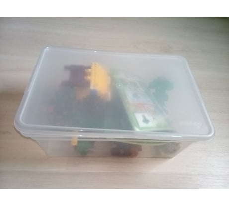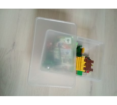 Плотный пластик и прозрачный, видно что внутри бокса. Удобен для детей.