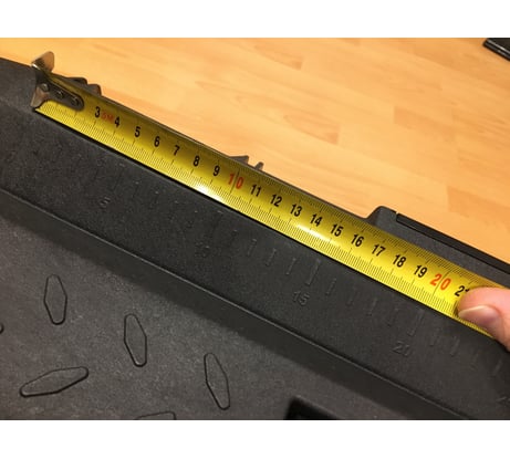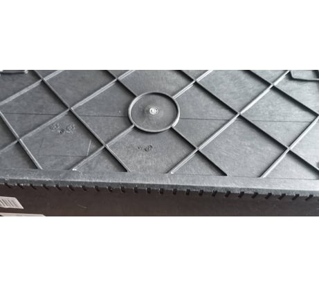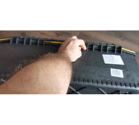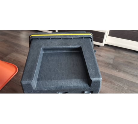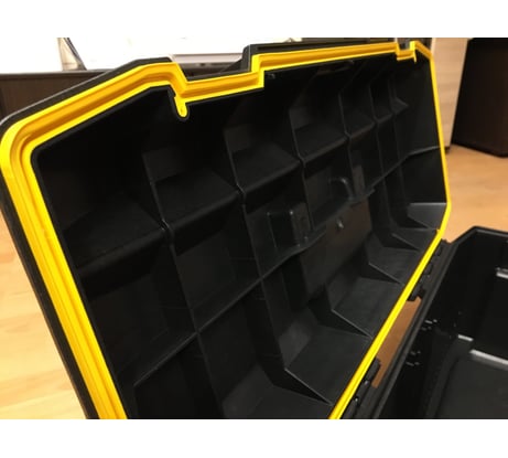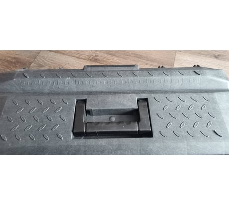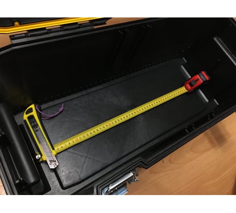 Прочная толстая пластмасса, ухватистая ручка для переноски, удобный жёлоб для фиксации материалов на крышке ящика, размеченный дюймовой и сантиметровой шкалой, из интереса сверил с рулеткой (соответствует); Нет мелких коробок-органайзеров в крышке, как у большинства моделей (для меня они не нужны тут); Крышка усилена многочисленными ребрами жесткости; По всему периметру крышки сделано уплотнение из мягкой резины; Форма ящика удлинненная и невысокая.