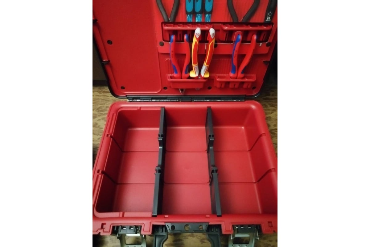 Очень тяжёлый. В гнёзда на крышке лезут только отвёртки с "голыми" жалами (не VDE), а шарнирно-губцевый инструмент и ключи болтаются и могут выскочить из гнёзд. Так же инструменты на крышке могут мешать её закрытию. Можно запихать в ящик довольно много всякого - но всё же меньше, чем ожидаешь изначально. Перегородки практически бесполезны - с ними много в ящик не засунуть.