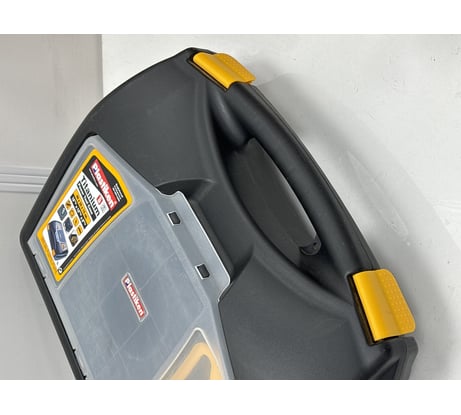 Внутри основного отдела нет органайзера для инструмента. Петли крышек сделаны полностью из пластмассы, нет металлического стержня, скрепляющего половинки - вся петля из пластмассы. Кейс сделан из тонкого пластика, из-за чего при закрывании кейса, иногда происходит перекос, когда половинки сдвигаются по оси петли. Цена в 1500р завышена для такого качества кейса, второй такой кейс дороже 1000р брать бы не стал.