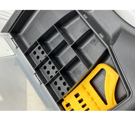 Отличный ящик для дрели или шуруповёрта. Прочный пластик. Есть отделения для свёрл, мелочёвки и бит. В основном отделении поместилась коробка для различных кордщёток. Пользуюсь ящиками для инструмента и крепежа этого производителя с 2006 г., до сих пор ещё "живы".