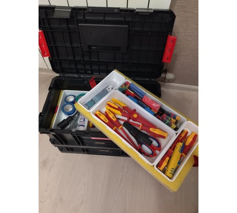 Один в один подходит к Декстеровскому ящику для инструмента из Леруа. Которых сейчас нет. Дополнил Кубриком. Пользуюсь не первый год для различного инструмента на стройке. Разных секций этой модели у меня много. Достоинства и недостатков найти можно. Лично меня они очень устраивают. Покупал из-за совместимости ящиков которые были.