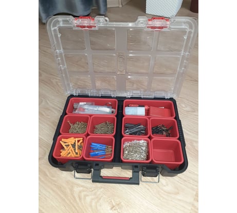 Отличный, крепкий органайзер, выполнен качественно. Замки железные, застегиваются надежно. На корпусе присутствуют ребра жесткости. Как я понимаю, фиксируется на систейнерах KETER. Собираюсь применять при установке межкомнатных дверей. Рекомендую к покупке.