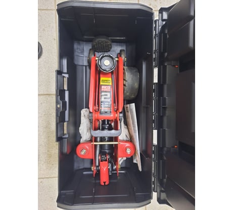 Покупалось под домкрат ( https://www.vseinstrumenti.ru/product/podkatnoj-domkrat-stayer-r-22-red-force-2t-125-320mm-43152-2-1233283/ ),- чувствует себя очень хорошо в новом домике! Не понравилась защёлка крышки - зачем такая мудрёная, не знаю. Пластик не вонючий, не хлипкий, не полиэтилен, но пластичен. Вставал на ящик ( во мне сто кг), даже немного попрыгал, - остался целый, даже не трещал. Если ищете что то подобное - это ваш вариант!