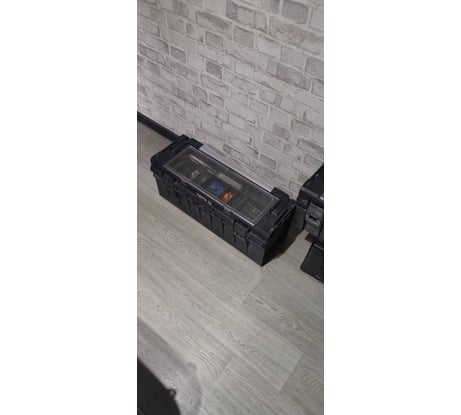 Легкий и прочный. Соединяется с такими же ящиками в блок.верхняя крышка прозрачный органайзер. Использую для электрики.