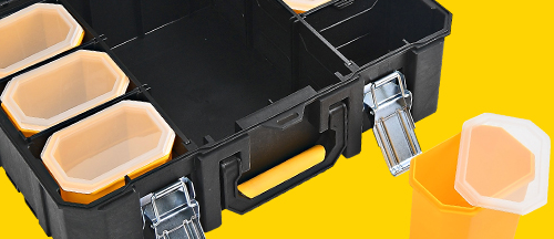 Но! Если Вы эти 6 баночек нагрузите, например, крепежом, то Стоит Вам наклонить ящик или в дороге машину тряхнёт хорошенько - будет у Вас микс. Первое что случится - это центральный в ряду желтый ящик выдавит ограничитель. Вообще, а зачем у ограничителей есть "салазки" для установки перегородок со всех сторон, если перегородки нельзя переставить в центр? Почему нет перегородки посередине? Ведь эти прекрасные стенки выдавливаются при любой мало-мальски значимой нагрузке (загрузке желтых контейнеров). Кроме того, ящик является верхним в стопке из нескольких ему подобных. НО! ручка у него сбоку, что бы носить его как кейс/чумодан, но не как ящик для инструментов. Крышка совершенно не несёт никакой нагрузки смысловой. Но рёбра жесткости в ней основательно "Съедают" объём. Сделайте рёбра над органайзерами и можно туда убрать какую-нибудь штуку с несколькими ячейками, например.