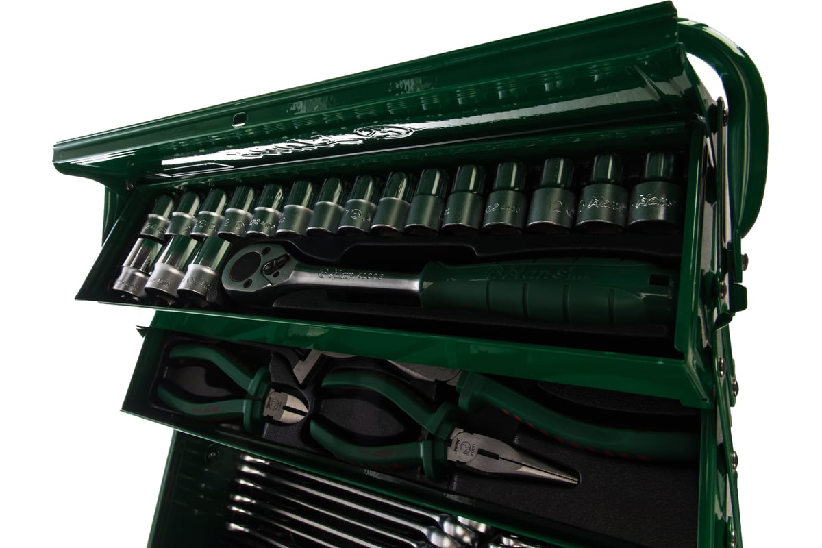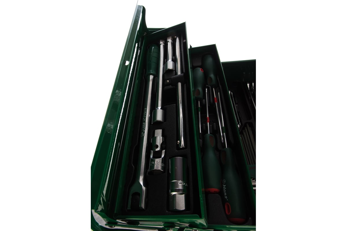 Ящик с набором инструмента Hans 68 предметов TTBK-68G обладает большим количеством приспособлением для обслуживания и ремонта. Комплект поставляется в металлическом ящике с несколькими отсеками для удобного размещения инструментов. Рабочие части изготовлены из высокопрочной стали. Рукоятки выполнены из двухкомпонентного материала и пластика.